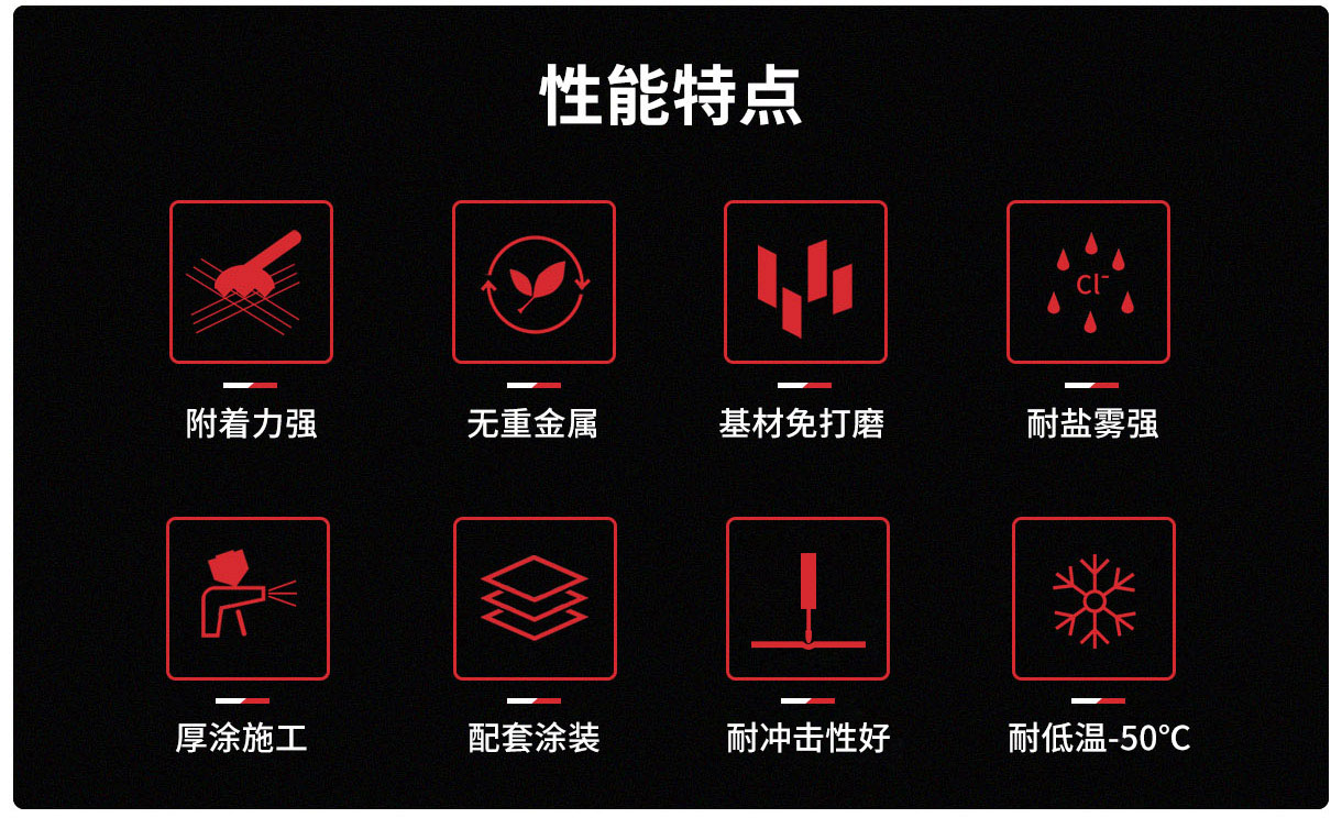 本产品对轻金属及光滑表面金属的附着力强;基材不用喷砂、不用打磨,去除油污即可涂装;耐盐雾性强;涂层可用于-50℃的低温环境;不含铅、铬等重金属,符合欧美RoHS标准。